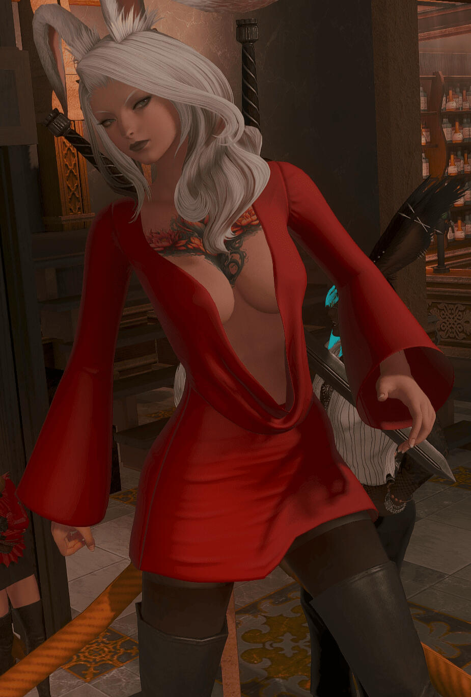 Her Lover. She met this handsome Elezen at his fight club out in Empyreum, The Femme Fatale. At first, she was not so sure about this mysterious man, but a chance encounter at the Harlot’s drunken tub night set into motion events that neither saw coming. He’s one of her most trusted confidants. She feels very safe with him and would move mountains to make sure he’s safe and happy.